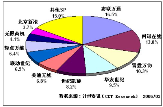 計世資訊(CCW Research)數(shù)據(jù)顯示:從各SP的收入構(gòu)成來看,IVR業(yè)務(wù)的市場集中度非常高。以中國聯(lián)通為例,收入前10位的SP有:志聯(lián)萬通、網(wǎng)訊在線、雷霆萬鈞、華友世紀、世紀凱旋、美通無線、聯(lián)動世紀、輕點萬維、無限商機、北京新浪,他們的總收入占到聯(lián)通全部IVR業(yè)務(wù)收入的85%。