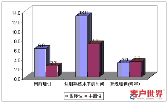 總體看來,印度呼叫中心提供平均為4.1周的崗前培訓(xùn)。其中,國際性呼叫中心平均提供6周崗前培訓(xùn),明顯高于本地性呼叫中心的2.3周。這是因為國際呼叫中心把崗前培訓(xùn)的相當(dāng)一部分時間投入到英語能力的培訓(xùn)和提高上面。此外,參加調(diào)研的呼叫中心主管認(rèn)為,新員工平均在開始工作10周以后才能達(dá)到熟練水平。同樣地,我們發(fā)現(xiàn)國際性呼叫中心和本地性呼叫中心在這一指標(biāo)上存在顯著差異。在國際性呼叫中心需要達(dá)到熟練水平的時間