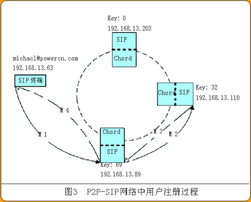 在本例中,SIP URI是michael@powercn.com,假定其哈希值是17,PN的Chord層會查找到負(fù)責(zé)處理該請求的PN Key值是32,find_responsible_pn(user)返回該PN的“IP地址∶端口”——192.168.13.110:5060。PN的SIP層比較該值發(fā)現(xiàn)不是自己,就將注冊請求轉(zhuǎn)發(fā)到該“IP地址∶端口”,如圖3中M2所示。