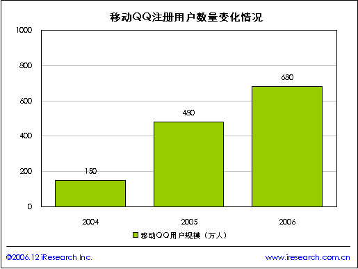 近兩年移動(dòng)QQ的市場(chǎng)規(guī)模迅速擴(kuò)大,iResearch研究結(jié)果顯示2006年移動(dòng)QQ用戶規(guī)模達(dá)到680萬(wàn)人,移動(dòng)QQ所帶來(lái)的現(xiàn)金收入成為騰訊上市公司最重要的收入之一。移動(dòng)IM與互聯(lián)網(wǎng)IM最大的不同在于產(chǎn)業(yè)鏈移動(dòng)運(yùn)營(yíng)商的參與。艾瑞認(rèn)為互聯(lián)互通是移動(dòng)IM產(chǎn)業(yè)整合和發(fā)展必然趨勢(shì)。