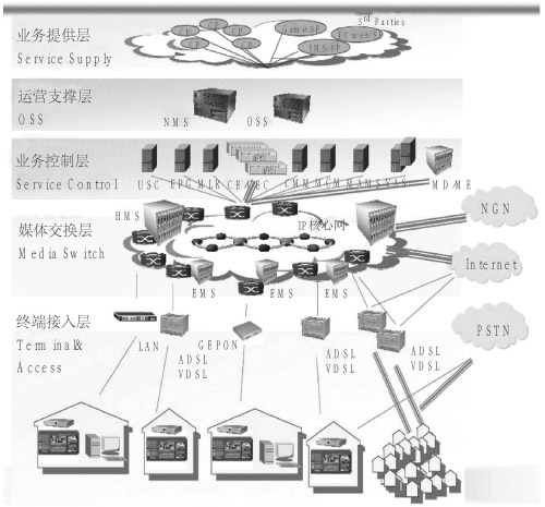 從系統(tǒng)的功能結(jié)構(gòu)層次來分,大致可分為業(yè)務層、控制層、媒體層、網(wǎng)絡承載層和接入層。