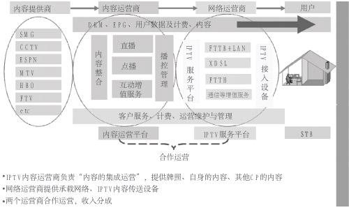 作為一個全新的產(chǎn)業(yè),迅速培養(yǎng)合理的業(yè)務模式和贏利模式是行業(yè)快速發(fā)展、形成成熟價值鏈的關鍵環(huán)節(jié)之一。上海文廣新聞傳媒集團在和電信與網(wǎng)通各試點地市合作的過程中,已經(jīng)初步形成廣電單位作為 IPTV內(nèi)容集成運營商,電信運營商提供寬帶網(wǎng)絡及IPTV系統(tǒng),雙方合作提供業(yè)務的業(yè)務模式。這一模式一方面可以發(fā)揮廣電在內(nèi)容監(jiān)管、內(nèi)容運營方面的優(yōu)勢,另一方面可以延續(xù)電信在互聯(lián)網(wǎng)運營和維護上的優(yōu)勢。雙方之間的合作是資源與資源的對接,優(yōu)勢與優(yōu)勢的合作,各用所長,共同推進,利益共享。