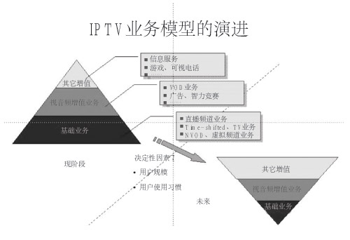 IPTV的盈利模式在不同的發(fā)展階段有不同的業(yè)務類型,在初期主要以付費頻道、VOD點播、時移電視等基本業(yè)務為主,并以探索贏利模式和互動性應用模式為主要目標。在業(yè)務發(fā)展成熟期,以用戶為導向的互動應用等增值業(yè)務將會是業(yè)務收入的主要來源,挖潛增效將是這一階段的中心任務。