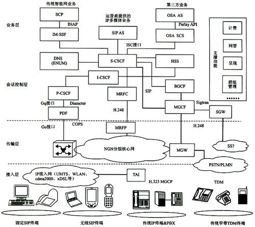 接入層支持各種有線(xiàn)和無(wú)線(xiàn)終端。固定和無(wú)線(xiàn)SIP終端可通過(guò)IP接入網(wǎng)直接鏈入,非SIP終端(如H.323)必須通過(guò)TAI(終端適配接口)完成H.323和SIP的轉(zhuǎn)換才能接入IP接入網(wǎng)。各種寬帶IP終端可通過(guò)MGW、MGCF、SGW實(shí)現(xiàn)與PSTN/PLMN域的傳統(tǒng)窄帶TDM(時(shí)分復(fù)用)終端實(shí)現(xiàn)互通。