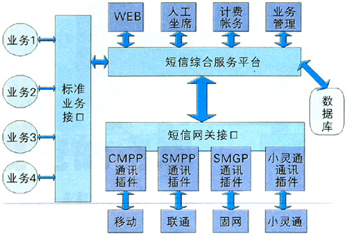 業(yè)務(wù)管理平臺(tái)是為運(yùn)營商提供的可快速啟動(dòng)各種數(shù)據(jù)業(yè)務(wù)的平臺(tái),具有強(qiáng)大的資源調(diào)度能力。它連接運(yùn)營商的基礎(chǔ)網(wǎng)絡(luò)和業(yè)務(wù)支撐系統(tǒng)(客服系統(tǒng)、計(jì)費(fèi)系統(tǒng)),為服務(wù)提供商/內(nèi)容提供商們提供各種移動(dòng)資源(如短信息中心資源、用戶信息資源、語音資源等)、功能資源(如單點(diǎn)認(rèn)證、計(jì)費(fèi)、漫游控制等)及各種公共的資源引擎(如地理位置、語音交互、推送信息等)。業(yè)務(wù)支撐系統(tǒng)是運(yùn)營商為了開展業(yè)務(wù)必須建設(shè)的客服系統(tǒng)、營業(yè)系統(tǒng)、計(jì)費(fèi)系統(tǒng)等子系統(tǒng)。圖3是目前常用的綜合短信平臺(tái)[3]。