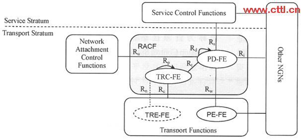 RACF由策略決策功能實體PD-FE和傳送資源控制功能TRC-FE兩個功能實體組成。PD-FE基于網絡策略規(guī)則、業(yè)務控制功能SCF提供的業(yè)務信息、網絡附著控制功能NACF提供的傳送層簽約信息,以及TRC-FE提供的資源接納決策結果,做出網絡資源接納控制的最后決策?梢曰诿總流對傳送層的策略執(zhí)行功能實體。PE-FE下發(fā)資源接納控制策略。TRC-FE負責收集和維護傳送網的拓撲和資源狀態(tài)信息,基于拓撲、連接性、網絡、節(jié)點資源的可用性以及接入網中的傳送層簽約信息等網絡信息控制資源的使用,提供傳送網絡接納控制的決策。PD-FE通過Rt參考點請求TRC-FE檢測或者決定所請求的媒體流路徑上的QoS資源。