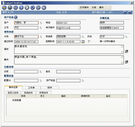 事件記錄應(yīng)該在某個(gè)服務(wù)臺(tái)工具中記錄和跟蹤,該工具最好是作為集成的服務(wù)管理工具集的構(gòu)成部分。該工具應(yīng)該在引發(fā)新的事件時(shí)提供最基本的事件記錄。比如為了幫助提高效率,當(dāng)你在天匯幫助臺(tái)的用于記錄事件的事件窗口中輸入請(qǐng)求發(fā)起者的姓名時(shí),利用客戶數(shù)據(jù)庫可以自動(dòng)填充諸如位置、部門和聯(lián)系詳細(xì)信息等字段。天匯幫助臺(tái)還支持使用計(jì)算機(jī)電話集成