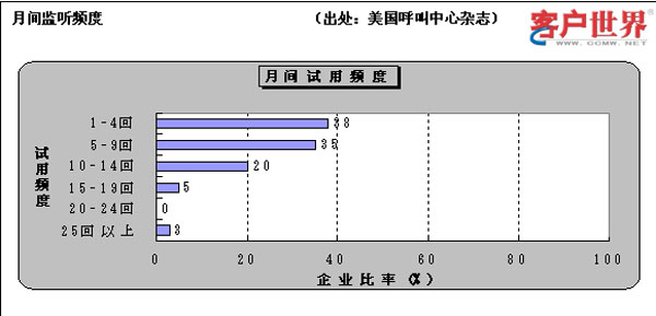 很多管理人感到頭疼的是,如何以監(jiān)聽的方式計算品質(zhì)分數(shù)。圖中顯示關(guān)于監(jiān)測頻度的調(diào)查結(jié)果。雖然判斷適當?shù)谋O(jiān)聽頻度也很重要,但最重要的是評價單上該填入哪些項目,這才是管理人最關(guān)心的事情。根據(jù)自己公司的狀況,選擇關(guān)于會話技能、業(yè)務(wù)知識、案件處理能力、技術(shù)水平、完成業(yè)務(wù)請求的程度等項目就可以。很多公司對外不公開這些評價單,說這屬于經(jīng)營客服中心的經(jīng)驗技術(shù),但從“友好競爭”的角度看,在業(yè)內(nèi)公開這種程度的“經(jīng)驗技術(shù)”,不會構(gòu)成中心實力上的競爭。