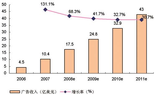 移動UGC的熱潮源自互聯(lián)網(wǎng)上的UGC應(yīng)用,潛在商機(jī)巨大。根據(jù)eMarketer的資料顯示(見圖1),2006年,美國UGC廣告收入為4.5億美元,2007年實現(xiàn)翻倍增長,達(dá)到10.4億美元。預(yù)計2011年其收入將增至43億美元。