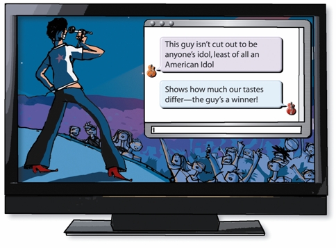 圖1:用戶可以一邊看“美國偶像”,一邊通過電視機(jī)向朋友發(fā)送短信,同時(shí)還研究最新競(jìng)爭(zhēng)對(duì)手的背景。