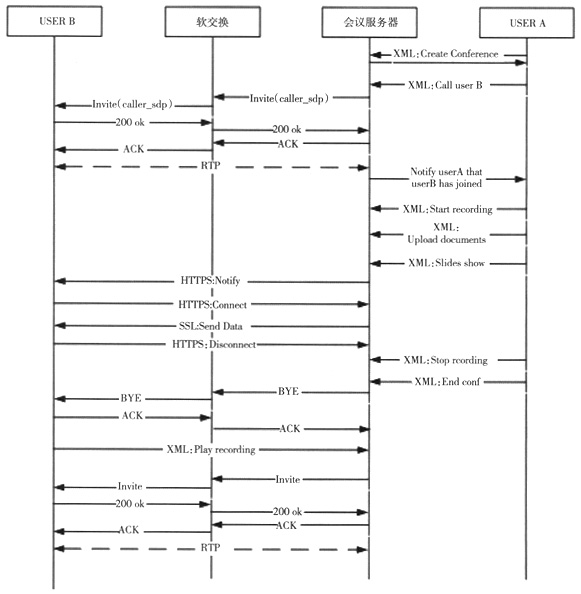 基于上述多媒體會議業(yè)務(wù)的實(shí)現(xiàn)流程,圖3給出了一個多媒體會議業(yè)務(wù)典型應(yīng)用的信令流程,具體包括對于用戶創(chuàng)建會議、邀請與會成員、會議中的,文件演示、會議的錄制與會議的回放等信令流程的描述。