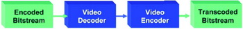 視頻轉(zhuǎn)碼是一個高運算負(fù)荷的過程,需要對輸入的視頻流進(jìn)行全解碼、視頻過濾/圖像處理、并且對輸出格式進(jìn)行全編碼。最簡單的轉(zhuǎn)碼過程(圖3)僅僅涉及到解碼一個比特流和用不同的編解碼器重新編碼兩個步驟。這種硬轉(zhuǎn)碼看似很簡單,只需要一個解碼器和一個編碼器,但是最終顯示結(jié)果并不理想,因為視頻數(shù)據(jù)解碼后重新編碼會降低畫質(zhì)。