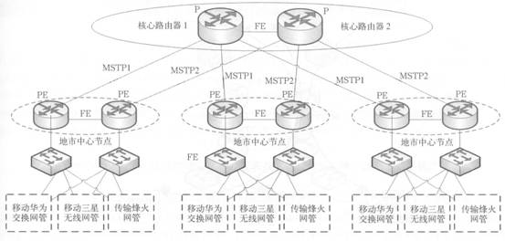 OSS承載網(wǎng)平臺(tái)骨干網(wǎng)絡(luò)包括省級(jí)匯聚節(jié)點(diǎn)、地市中心節(jié)點(diǎn)以及地市接入網(wǎng)絡(luò),需要承載的系統(tǒng)包括各專業(yè)網(wǎng)管和綜合網(wǎng)管系統(tǒng)。