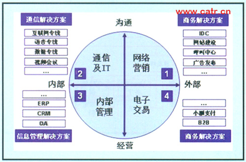 企業(yè)客戶對(duì)電信服務(wù)的需求,集中體現(xiàn)為實(shí)現(xiàn)企業(yè)商業(yè)過(guò)程的綜合通信信息整體服務(wù),具體可以按縱向溝通、經(jīng)營(yíng)和橫向內(nèi)部、外部分為四部分:內(nèi)部員工溝通、內(nèi)部經(jīng)營(yíng)管理、外部客戶營(yíng)銷以及產(chǎn)品銷售實(shí)現(xiàn)。與之相對(duì)應(yīng)的需求如圖2所示。
