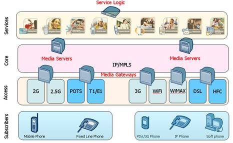 在下一代增值業(yè)務(wù)網(wǎng)絡(luò)里,業(yè)務(wù)平臺(tái)由一系列不同功能的應(yīng)用服務(wù)器組成,同時(shí)為固網(wǎng)/移動(dòng)/IP客戶(hù)提供增值業(yè)務(wù)。以彩鈴業(yè)務(wù)平臺(tái)為例,彩鈴的簽約用戶(hù)可以是移動(dòng)用戶(hù),也可以是固定電話,小靈通用戶(hù)或IP用戶(hù);系統(tǒng)也會(huì)根據(jù)終端的能力和簽約類(lèi)型,自動(dòng)選擇是提供音頻彩鈴或視頻彩鈴業(yè)務(wù)。