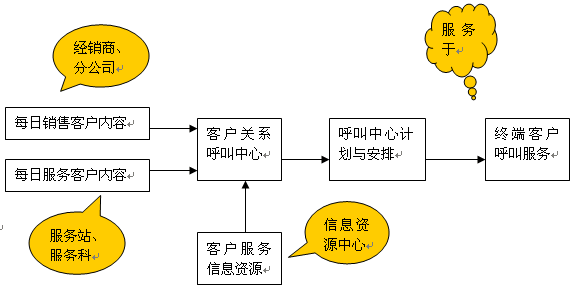 呼叫中心的回訪呼叫工作、咨詢服務呼叫和問題投訴呼叫需要掌握大量的客戶信息資源和公司的產(chǎn)品與服務政策信息,而這方面的信息需要由客戶購車過程、維修過程和公司內(nèi)部的相關部門提供。