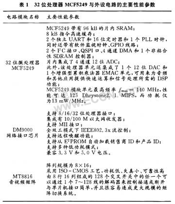 MCF5249模塊單元主要由32位處理器MCF5249和若于外圍器件AM29LV160DB90快閃存儲器、K4S281632SDRAM、SP3223串行通訊電路、DM9000網絡接口芯片、MT8816音視頻矩陣電路等硬件構成。其主要性能如下表1所示。