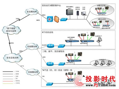 福建省農(nóng)業(yè)廳主管全省農(nóng)業(yè)、畜牧、農(nóng)機、農(nóng)墾等工作,設(shè)區(qū)市及縣(市、區(qū))設(shè)置農(nóng)業(yè)局主管相應(yīng)工作,其中部分設(shè)區(qū)市、縣農(nóng)業(yè)局和畜牧局分設(shè)。全省農(nóng)業(yè)視頻會議系統(tǒng)設(shè)計在省農(nóng)業(yè)廳、設(shè)區(qū)市農(nóng)業(yè)局、畜牧局建設(shè)各自分會場,非設(shè)區(qū)市所在地的縣(市、區(qū))至少建設(shè)一個分會場,使得全省農(nóng)業(yè)系統(tǒng)多部門均能在縣級或設(shè)區(qū)市所在城鎮(zhèn)同城就近開會。系統(tǒng)可以在今后進行擴展建設(shè),使全省縣級農(nóng)業(yè)、畜牧部門都能夠建設(shè)各自分會場。
