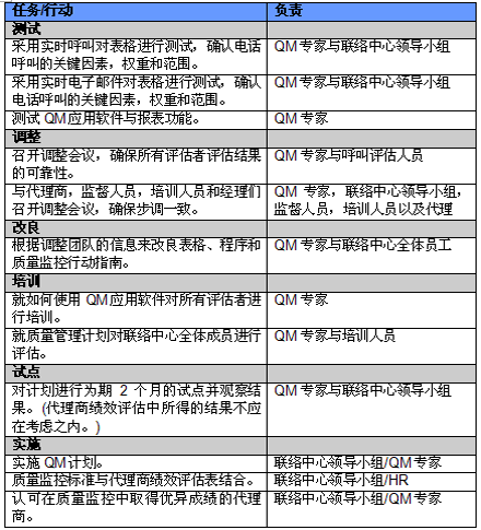 4. 開展項(xiàng)目交流。管理人員必須就新的或者修繕后的QM計(jì)劃與代理商進(jìn)行交流。QM的成功與否與代理商的合作密不可分,如果代理商受邀參與新QM計(jì)劃的開發(fā)并且所有改變都在雙方之間明確交流過,那么成功的機(jī)會(huì)也將大大提高。交流的內(nèi)容應(yīng)包括為什么要開發(fā)這樣一個(gè)計(jì)劃,它的作用和職責(zé)是什么,它對(duì)代理商會(huì)產(chǎn)生哪些影響(對(duì)于他們的評(píng)估和提升)以及它能帶來哪些好處。幫助代理商認(rèn)識(shí)到QM計(jì)劃積極的一面很重要,因?yàn)橹挥羞@樣才能讓他們看到QM不僅僅是管理人員用來告訴他們做錯(cuò)了事情的一種手段。讓聯(lián)絡(luò)中心全體員工參與QM計(jì)劃的開發(fā)能夠建立他們對(duì)該計(jì)劃的支持,提高接受度的同時(shí)避免不知所措。這對(duì)聯(lián)絡(luò)中心剛剛嶄露頭角,QM計(jì)劃還未全面鋪開的中國市場(chǎng)而言尤為重要。