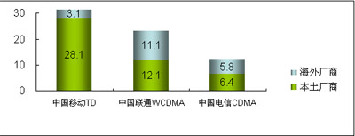 在3G設(shè)備市場方面,2008年,中國的WCDMA、CDMA2000與TD-SCDMA三種3G網(wǎng)絡(luò)在建設(shè)上有不同的進(jìn)展。中國移動(dòng)啟動(dòng)了第二階段的TD-SCDMA網(wǎng)絡(luò)建設(shè)、中國電信啟動(dòng)了涉及面向81個(gè)重點(diǎn)城市的CDMA全網(wǎng)招標(biāo)、而中國聯(lián)通也開始7個(gè)城市建立WCDMA試驗(yàn)網(wǎng)絡(luò)的建設(shè)工作。而在所有的網(wǎng)絡(luò)建設(shè)中,中國本土廠商借3G契機(jī)迅速提升競爭力,占據(jù)了3G網(wǎng)絡(luò)建設(shè)大部分市場份額。