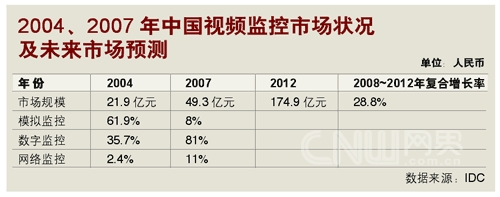 IDC的數(shù)字同樣樂觀。跟據(jù)IDC在2008年的預(yù)測,2008~2012年,中國視頻監(jiān)控市場的年均復(fù)合增長率將達28.8%,遠高于IT市場投入的平均增長率。而在模擬、數(shù)字與IP模式(即網(wǎng)絡(luò)監(jiān)控)組成的視頻監(jiān)控市場里,IP的增長率又將高于前二者,成為市場增長的強勁動力。”(注:模擬監(jiān)控是指圖像信號在采集后,通過模擬信號傳輸?shù)姆忾]式視頻監(jiān)控系統(tǒng)模式;數(shù)字監(jiān)控是指圖像信號在采集后,經(jīng)過編碼轉(zhuǎn)化成數(shù)字信號再進行傳輸?shù)姆忾]或半封閉式視頻監(jiān)控系統(tǒng)模式;網(wǎng)絡(luò)監(jiān)控是指系統(tǒng)建立在以網(wǎng)絡(luò)為基礎(chǔ)的傳輸平臺的開放式視頻監(jiān)控系統(tǒng)模式)。