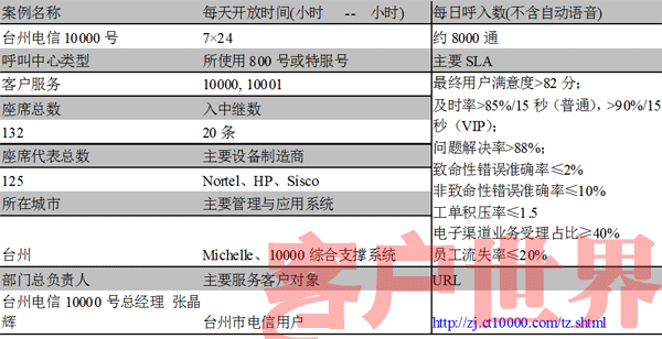 中國電信臺州市的10000客服中心,擁有100多名員工,承擔該市電信公司對外的所有客戶服務工作。中心先后被浙江省電信工會授予“先進女職工集體”,浙江省電信分公司授予“學習型示范班組”、“創(chuàng)建學習型組織先進班組(團隊)”,并獲得了“集團公司優(yōu)秀10000號服務團隊”,同時被中華全國總工會、信息產(chǎn)業(yè)部、共青團中央授予“全國先進女職工集體”以及“全國青年文明號”的稱號,連續(xù)兩年被信息產(chǎn)業(yè)部評定為“全國用戶滿意電信服務明星班組”。