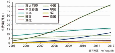 圖1:根據(jù)國家和地區(qū)細(xì)分的2005年到2012年亞太區(qū)家庭網(wǎng)絡(luò)發(fā)展趨勢