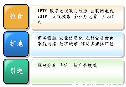 從廣義上講,廣電、電信、互聯(lián)網(wǎng)都屬于信息行業(yè),現(xiàn)在都面臨著自己在增長中遇到的問題,也就是滯漲。滯漲逼迫大家必須去轉(zhuǎn)型,轉(zhuǎn)型現(xiàn)在有三種方式,一個(gè)是搶,一個(gè)是擴(kuò),一個(gè)是引進(jìn)。從最近會議上來看,目前大家對搶食比較感興趣,畢竟有現(xiàn)成的一碗紅燒肉已經(jīng)做好了,對后面兩個(gè),相對來說談得還比較少,因?yàn)楹竺鎯蓚(gè),需要引入一些創(chuàng)新的技術(shù),引入創(chuàng)新的思維。
