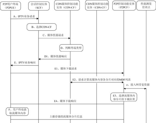 本架構(gòu)的最大特點是結(jié)合CDN和NGN架構(gòu)(注:為了簡化沒有給出詳細(xì)的NGN相關(guān)控制實體,架構(gòu)中只體現(xiàn)了會話控制實體和資源接納控制功能實體),在此基礎(chǔ)上引入P2P相關(guān)功能,包括P2P控制實體和P2P用戶終端。通過對基于NGN的IPTV架構(gòu)和CDN架構(gòu)的改進(jìn),使該架構(gòu)既能夠具備電信網(wǎng)中網(wǎng)絡(luò)資源可控、可管的特征,又通過引入P2P具備了一定的靈活性和自組織能力,將電信網(wǎng)和互聯(lián)網(wǎng)技術(shù)的優(yōu)勢均集中在了一起。