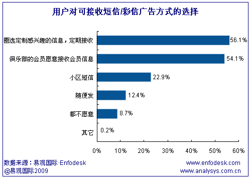 從用戶對短信廣告的接受程度來看,用戶對于自己感興趣領(lǐng)域的短信廣告并不反感,甚至樂于接受或定制。根據(jù)易觀國際Enfodesk發(fā)布的用戶調(diào)研數(shù)據(jù),56.1%的用戶愿意定制自己感興趣的信息,54.1%的用戶愿意接受會員信息,只有8.7%的用戶不愿意接受任何形式的短信/彩信廣告。但是這類用戶樂于接受的短信廣告反而一般有固定的端口號,更容易被攔截,因此易觀國際(Analysys