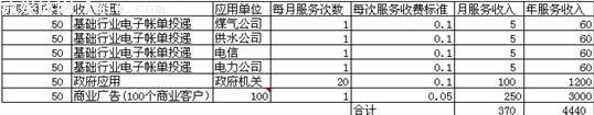 那么如果一家運營商已經(jīng)設計出了符合市場需求的業(yè)務模式,未來的盈利前景將會怎樣呢?不妨讓我們模擬分析一下。假設一個運營商擁有50萬左右的城市家庭用戶。在基礎行業(yè)領域,每月可以幫助煤氣、供水、電信和電力公司各發(fā)送1次賬單;在商業(yè)客戶方面,擁有百家左右的合作伙伴,每月每家合作伙伴發(fā)送1條短信廣告;在政府機關領域,粗略估算政府機關每月總計使用20次左右;每個家庭用戶則每月收到電信短信約125條。假設運營商的服務資費中,除了商業(yè)廣告為0.05元/條外,均為0.1元/條。那么,盈利情況又該怎樣呢?