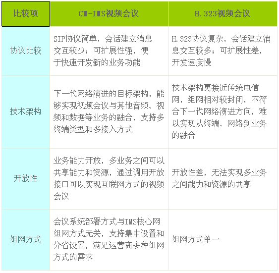 IMS是下一代網(wǎng)絡(luò)演進(jìn)的核心技術(shù),基于中國移動CM-IMS的視頻會議在全面支持語音、視頻、數(shù)據(jù)會議和高清會議功能的同時,有效解決了傳統(tǒng)H.323會議系統(tǒng)互通性差、終端要求高、業(yè)務(wù)可擴(kuò)展性低等問題,成為中國移動視頻會議發(fā)展的主流技術(shù)。CM-IMS的視頻會議與傳統(tǒng)的H.323會議相比,具有以下技術(shù)優(yōu)勢: