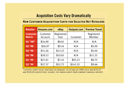 上世紀90年代末期DOT.COM就遭遇了這一嚴峻問題。70% - 80%的客戶在沒有完成采購之前就棄網站而去。對于許多人來說這被認為是一個“行業(yè)基準”,屬于可接受水平,但也有些人開始尋找解決方案。整個行業(yè)開始注意到分析家們的忠告:這一水平的放棄率是不被允許的。下面這張由Yankee集團在2000年發(fā)布的表格向我們展示了電子商務企業(yè)客戶獲取成本螺旋形盤升的過程。