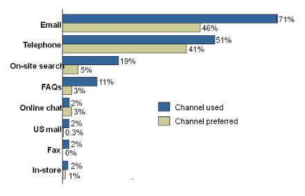 正是基于這一點供應商們紛紛加入PeopleSupport的陣營,并且在這之后不久統(tǒng)一的排隊技術就問世了,更在之后發(fā)展成全面集成的聯(lián)絡中心解決方案和eCRM套件。這些系統(tǒng)允許聯(lián)絡中心將電話流與交談、電子郵件、郵寄信件和傳真混合起來,現(xiàn)在,SMS也來了。Forrester調研機構2005年進行了一個調研,意在檢測客戶偏愛的聯(lián)絡渠道有哪些以及他們實際使用的渠道又是哪些。該調研貫穿全美所有類型的企業(yè)(并不局限于電子零售商或DOT.COM們)