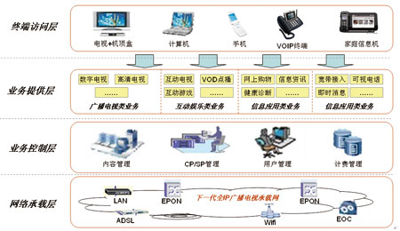 目前用戶是通過(guò)電視+機(jī)頂盒的方式享受廣電運(yùn)營(yíng)商提供的數(shù)字電視服務(wù),而未來(lái)用戶可通過(guò)計(jì)算機(jī)、手機(jī)、VOIP終端、家庭信息機(jī)等多樣化的終端訪問(wèn)廣電運(yùn)營(yíng)商所提供的寬帶接入服務(wù)、VOIP的語(yǔ)音服務(wù)、各種信息化應(yīng)用服務(wù)。