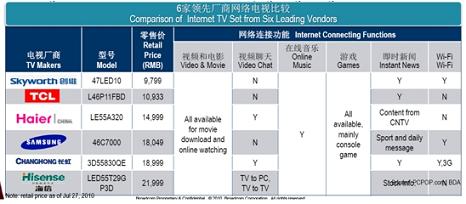 “相比國外廠商認(rèn)為規(guī)則尚不明確,持保守態(tài)度,國內(nèi)的電視機(jī)廠商比國外同行顯得更熱衷網(wǎng)絡(luò)電視。”Michael表示,“長虹、TCL、海信、康佳及創(chuàng)維等廠商都在2009年推出了各自的網(wǎng)絡(luò)電視系列,網(wǎng)絡(luò)電視被國內(nèi)電視廠商視為開拓藍(lán)海市場,獲取更多利用的機(jī)會。尤其在三網(wǎng)融合的背景下,網(wǎng)絡(luò)電視在中國被普遍認(rèn)為將有很大前景!