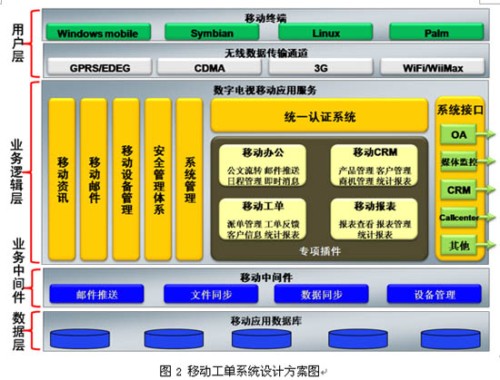 移動(dòng)工單系統(tǒng)是在Windows Mobile智能手機(jī)操作系統(tǒng)上自主研發(fā),采用B/S和C/S混合架構(gòu),以TCP/IP作為基礎(chǔ)數(shù)據(jù)傳輸協(xié)議,通過移動(dòng)通信網(wǎng)絡(luò)無線數(shù)據(jù)通道GPRS/EDGE/CDMA1x等,將呼叫中心的工單數(shù)據(jù)推送到智能手機(jī)上,由外勤服務(wù)人員將服務(wù)情況進(jìn)行實(shí)時(shí)的反饋。利用的同步中間件可將最新的資訊文件推送到手機(jī)終端上,服務(wù)人員無需登錄即可在終端可以查看最新的廣電資訊,可支持doc、xls、ppt等 Office文檔格式的瀏覽,支持WMV、WAV、3GP多種音視頻文件播放。服務(wù)人員可以不受地點(diǎn)和時(shí)間的限制通過終端實(shí)時(shí)獲取最新的多媒體客戶交互中心運(yùn)營數(shù)據(jù)報(bào)表,圖2為系統(tǒng)設(shè)計(jì)方案圖。