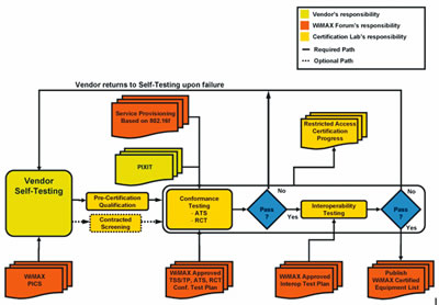 WiMAX認證程序2004年10月被批準(zhǔn),到2005年中期開始正式實行。整個認證流程對物理層和媒體接入層(MAC)進行兩種類型的測試,即性能測試和互通性測試。前者是為了確保設(shè)備可以正確實現(xiàn)由IEEE802.16以及ETSIHiperMAN標(biāo)準(zhǔn)給定的技術(shù)規(guī)范,而后者是檢驗不同廠家的產(chǎn)品在同一網(wǎng)絡(luò)中的協(xié)同工作情況,互通性測試要求至少三家以上不同公司的設(shè)備參與,它們具有相同的系統(tǒng)配置文件(頻譜波段、信道寬度以及雙工方式)。