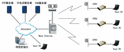 上文介紹的主要測試領(lǐng)域側(cè)重實驗室環(huán)境,運營商在對設(shè)備經(jīng)過一定程度上的實驗室測試后,一般會進一步進行外場測試。在外場測試中,覆蓋、容量、多終端下的QoS保證、移動性、長時傳輸能力等方面將成為重點的測試內(nèi)容,下面就針對固定WiMAX技術(shù),對其部分外場測試內(nèi)容進行介紹(典型外場測試框圖參考圖3)。