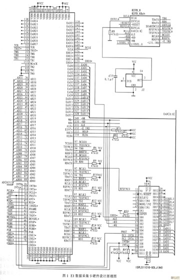 隨著電信網(wǎng)絡(luò)迅速發(fā)展,基于軟交換技術(shù)的NGN網(wǎng)絡(luò)應(yīng)運而生。在構(gòu)建中,NGN需通過信令網(wǎng)關(guān)SG與現(xiàn)有的七號信令網(wǎng)互通,但在物理上采用HDLC格式的 E1傳輸。為了維護(hù)NGN網(wǎng)絡(luò),實現(xiàn)不同采集口的多協(xié)議關(guān)聯(lián)、呼叫的合成等功能,相應(yīng)的測試儀表必須提供網(wǎng)卡和E1卡的測試接口。根據(jù)NGN網(wǎng)絡(luò)測試儀表的總體設(shè)計方案要求,數(shù)據(jù)采集卡采用PCI插槽,E1信號經(jīng)物理接口器件成幀,通過串口送給MUSYCC,完成消息重組,最后通過PCI總線將消息送至上層軟件進(jìn)行協(xié)議分析處理。數(shù)據(jù)采集卡提供網(wǎng)絡(luò)接口的物理層、鏈路層功能以及PCI規(guī)范接口,可同時監(jiān)測8路E1信號。