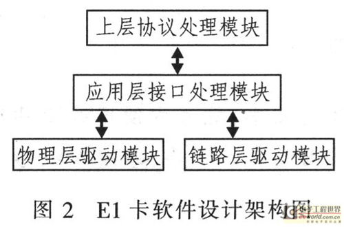 E1采集卡軟件設(shè)計架構(gòu)主要由鏈路層驅(qū)動模塊、物理層驅(qū)動模塊、應(yīng)用層接口處理模塊和上層協(xié)議處理模塊組成,如圖2所示。驅(qū)動程序是數(shù)據(jù)采集卡的基礎(chǔ),它負(fù)責(zé)E1接口數(shù)據(jù)采集和數(shù)據(jù)重組,并通過共享內(nèi)存與PC機實現(xiàn)數(shù)據(jù)交互,以及控制指令動作和硬件狀態(tài)報告等。
