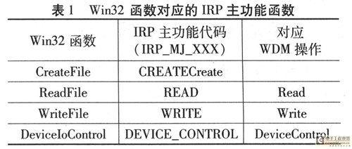 在Windows中,應(yīng)用程序與WDM通信的實現(xiàn)過程:應(yīng)用程序應(yīng)先獲得設(shè)備句柄GUID碼,然后利用CreateFile函數(shù)打開設(shè)備,通過 DeviceIoControl函數(shù)傳遞控制代碼參數(shù)和WDM進(jìn)行通信,包括從WDM中讀取數(shù)據(jù)和寫數(shù)據(jù)給WDM兩種情況,也可利用ReadFile從 WDM中讀取數(shù)據(jù)或用WriteFile寫數(shù)據(jù)給WDM:當(dāng)下層驅(qū)動有觸發(fā)事件時,就需要Event事件通知上層軟件。當(dāng)應(yīng)用程序退出時,CloseHandle則關(guān)閉設(shè)備,這將產(chǎn)生對應(yīng)于此設(shè)備對象的相應(yīng)IRP消息。這種關(guān)系如表1所列。