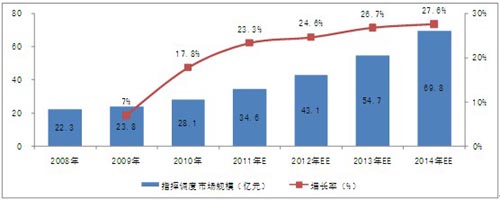 根據(jù)對(duì)下游行業(yè)的調(diào)研和關(guān)聯(lián)市場的分析,2010年,中國指揮調(diào)度市場規(guī)模已達(dá)到28.1億元。隨著下游行業(yè)投資規(guī)模的擴(kuò)大、產(chǎn)品的升級(jí)換代及技術(shù)的發(fā)展,行業(yè)市場規(guī)模將保持較快的增長速度,未來4年的復(fù)合增長率為26.31%,2014年,市場規(guī)模將達(dá)到69.8億元。