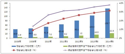 圖表 5 2008-2014年中國融合會(huì)議市場規(guī)模及增長率