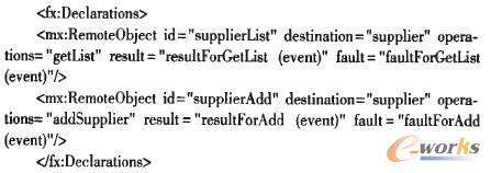 客戶層采用Flex4的Spark UI組件和ActionScript分別實現(xiàn)MVC模式的View和Control層,實現(xiàn)與系統(tǒng)用戶的交互,并通過Spring BalazeDs集成框架發(fā)布的Remote Object,實現(xiàn)與業(yè)務(wù)層對象的通訊,進而完成CRM業(yè)務(wù)處理。如下代碼為Flex中聲明Remote Object: