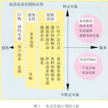 ——圖2表示以電話營銷的目的及對(duì)象為軸分析電話營銷的應(yīng)用。縱軸為對(duì)象,分為“特定”和“不特定”,橫軸為目的,分為“服務(wù)”和“銷售”。這樣右上區(qū)域=“特定對(duì)象X服務(wù)”,即為客戶服務(wù),右下區(qū)域=“不特定對(duì)象X服務(wù)”,對(duì)應(yīng)信息咨詢;左側(cè)為銷售。從對(duì)象來看,服務(wù)更偏重于“特定對(duì)象”。從目的來看,訂購/預(yù)約受理是最直接的銷售行為,所以放在最左,銷售支持在中間,促銷活動(dòng)靠右。
