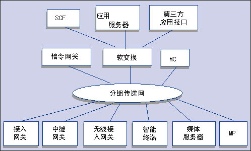 接入層包括各種接入網(wǎng)關(guān)、中繼網(wǎng)關(guān)、無線接入網(wǎng)關(guān)、智能終端以及與處理媒體有關(guān)的媒體服務(wù)器和多點(diǎn)處理器(MP)。傳送層包括提供IP包轉(zhuǎn)發(fā)的各種承載網(wǎng)功能實(shí)體?刂茖邮荖GN網(wǎng)絡(luò)的核心,主要包括軟交換設(shè)備、信令網(wǎng)關(guān)和多點(diǎn)處理器。業(yè)務(wù)層則主要包括應(yīng)用服務(wù)器、第三方應(yīng)用接口和傳統(tǒng)智能網(wǎng)功能。該業(yè)務(wù)層通過開放的業(yè)務(wù)層接口向用戶提供傳統(tǒng)智能網(wǎng)業(yè)務(wù)、多樣化的第三方業(yè)務(wù)和增值業(yè)務(wù)。