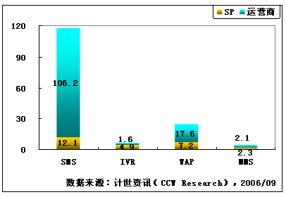 計世資訊(CCW Research)數(shù)據顯示,2006年第二季度,移動增值業(yè)務市場規(guī)模達到182億元人民幣,移動增值業(yè)務指依托移動通信網絡所提供的基本服務而開展的增值數(shù)據業(yè)務服務,市場規(guī)模包括移動運營商和服務提供商(SP)收入。其中SMS、IVR、CRBT、WAP和MMS市場規(guī)模分別為118.3、6.5、15.7、24.8和4.4億元人民幣,其他移動增值業(yè)務市場規(guī)模12.3億元人民幣,包括JAVA、BREW、移動定位等業(yè)務。