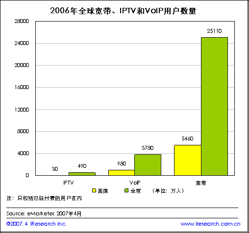 iResearch艾瑞市場咨詢根據(jù)eMarketer最新的數(shù)據(jù)發(fā)現(xiàn),寬帶上網(wǎng)環(huán)境為一些列的寬帶平臺應(yīng)用產(chǎn)品創(chuàng)造了良好的使用環(huán)境,各種服務(wù)同步發(fā)展起來。隨著全球?qū)拵в脩魯?shù)量的逐漸增加,全球IPTV和VoIP用戶也迅速成長。到2006年全球?qū)拵в脩暨_(dá)到2.511億人,VoIP和IPTV的全球用戶數(shù)量也分別達(dá)到了3780萬人和490萬人。