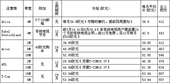 德國2007年第二、三季度上網(wǎng)資費價格一覽,其中德國電信T-Com的并非包含IPTV的套餐價格